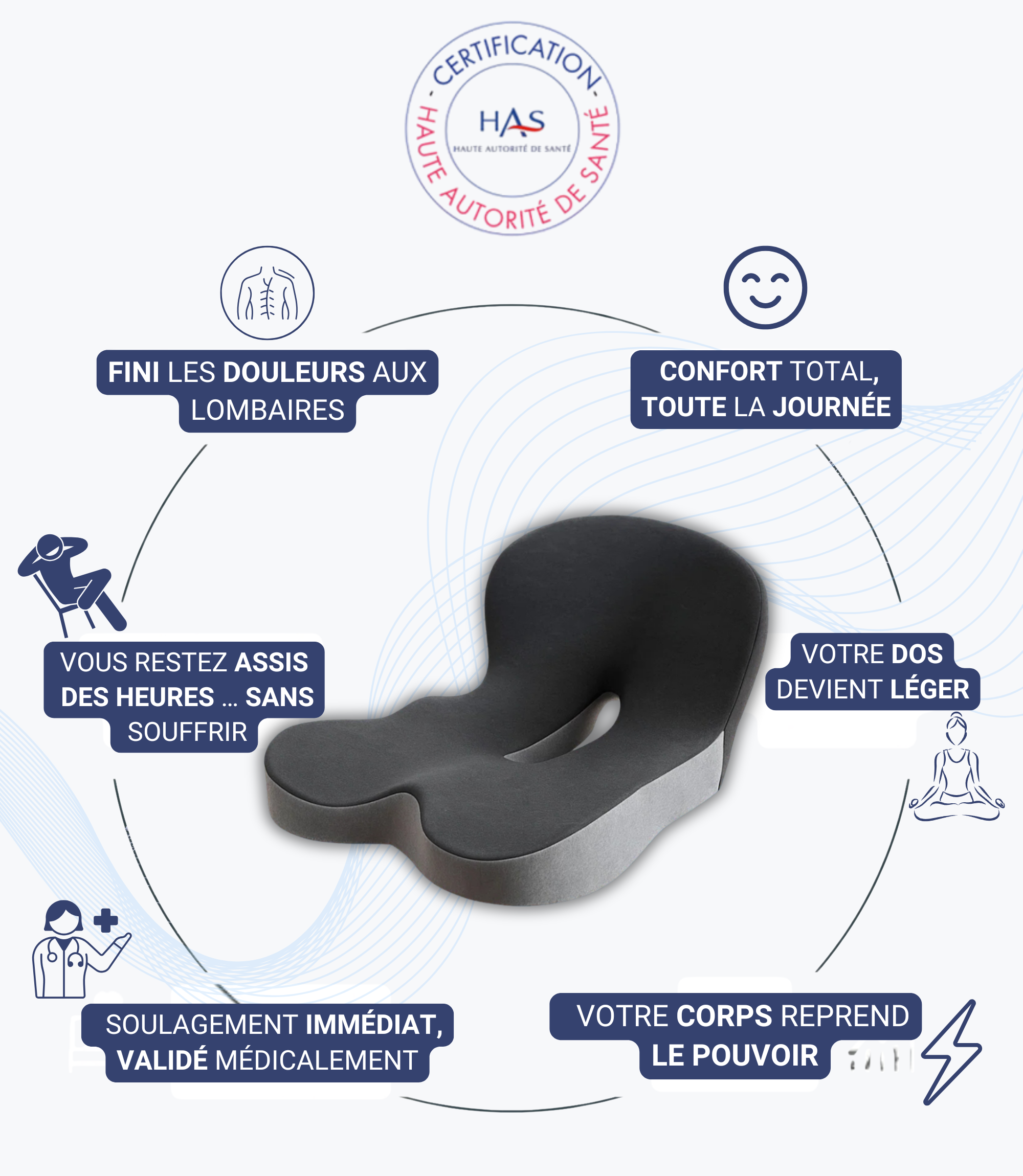 En tant que kinésithérapeute, je vois chaque jour des patients souffrant de douleurs lombaires dues à une mauvaise posture assise. Ce coussin fait vraiment la différence :  alignement, confort, soulagement.